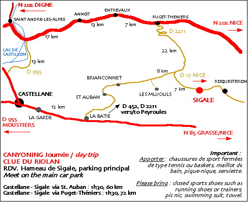 | Déroulement Rendez-vous à 9h00 à St. Auban (45 mn. de route de Castellane, voir plan d'accès) ou rendez-vous à 10h00 sur le parking à l'entrée du village de Sigale (1h15mn. de route de Castellane, voir plan d'accès), en fonction de votre point de départ. Le guide d'ABOARD Rafting nous accueillera à St Auban, d'où vous le suiverez pour rejoindre Sigale où il organisera une navette afin de déposer des véhicules à l'arrivée du canyon.  Après vous avoir remis votre équipement, il fera un briefing