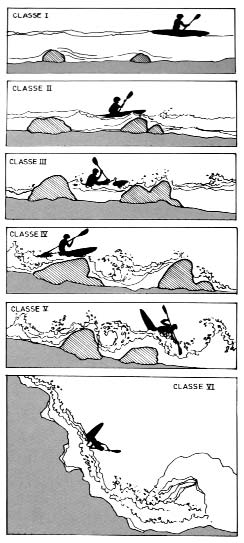 difficulté peut varier en fonction du débit de la rivière. Classe I = facile: cours régulier, vagues régulières, petits remous, obstacles simples. Classe II = moyennement difficile: (passage libre) cours irrégulier, vagues irrégulières, remous moyens, faibles tourbillons et rapides, obstacles simples dans le courant, petits seuils. Classe III = difficile: (passage visible) vagues hautes irrégulières, gros remous, tourbillons et rapides. Bloc de roche, petites chutes,obstacles divers dans le courant. Classe IV = très difficile: (passage non visible d'avance, reconnaissance généralement nécessaire) grosses vagues continuelles, rouleaux puissants et rapides. Roches obstruant le courant, chutes plus élevées avec rappels. Classe V = extrèmement difficile: (reconnaissance inévitable) vagues ,tourbillons, rapides à l'extrème. Passages étroits, chutes très élevées avec entrées et sorties difficiles. Classe VI = limite de la navigabilité: (généralement impossible) éventuellement navigable selon les niveaux des eaux. Grands risques.