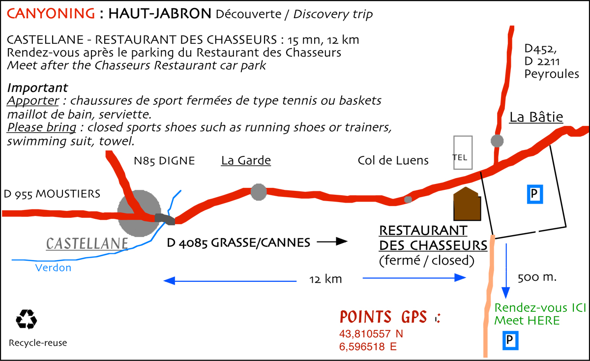 | Dimanche matin: Canyoning demi-journée Rendez-vous à 9h00 à la Batie, proche du site de canyoning du Jabron (comptez 15 mn. de route depuis Castellane), voir plan d'accès.   Accueil des participants par les guides de canyoning