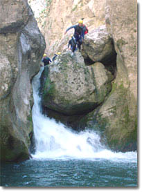 | Programme Meet at 9:30 am or 2:00 pm at the canyoning site of St. Auban (see acces map) The canyoning guide is there to welcome you. He gives a safety talk, introduces you to the environment and to the abseiling techniques, and hands out your equipment. St. Auban canyon has a lot a water and promises to give you plenty of opportunities to swim, slide on natural slides and jump. The activity begins with two short slides. A 6 m jump brings you to the point where the canyon becomes deeper and narrower. You then climb down a few obstacles and arrive at the top of a beautiful waterfall which you cross by sliding on a tight rope attached at the other side of the canyon. A 5 m jump follows, and the canyon opens up again. After that point, you can enjoy a few jumps - up to 7 m if you wish to - and a few more exciting slides still await you. At the bottom of the canyon, a short walk is necessary to return to the starting point. Due to local reglementation, St-Auban canyon is accessible only on Mondays, Wednesdays, Fridays and Sundays. |